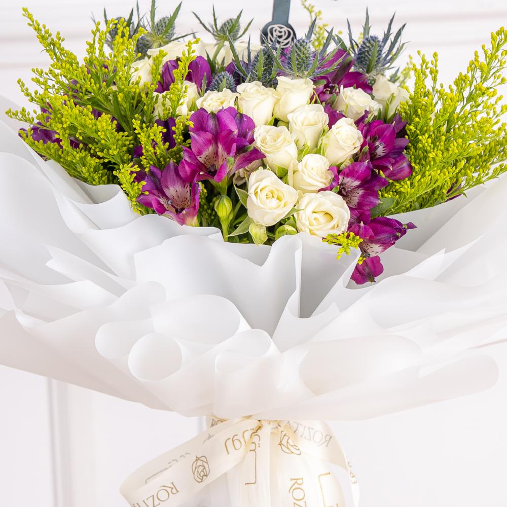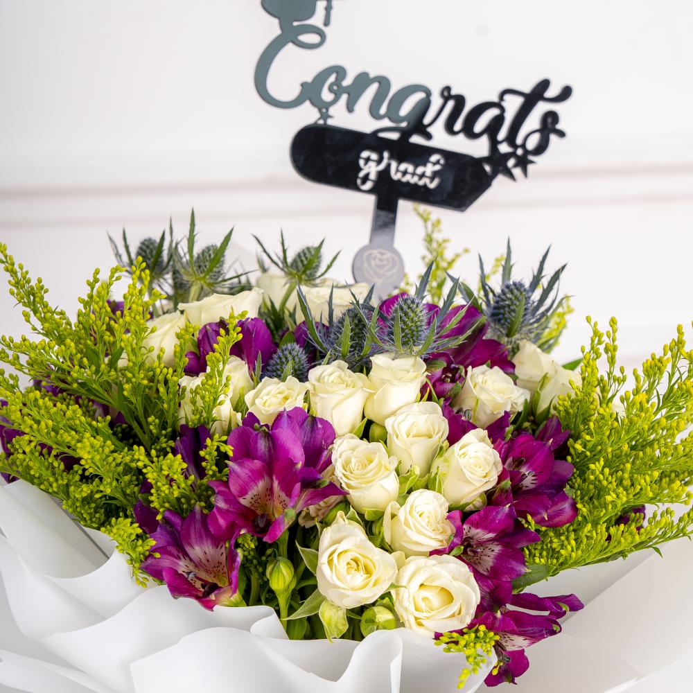باقة من الورود الطبيعية ذات اللون الأبيض النقي والبنفسجي الملكي، مع لمسات خضراء. تتوسطها تغريسة بعبارة "Congrats" لتعبّر عن تهنئتك بفخر. تصميم راقٍ للاحتفال بالنجاح والتخرج أو أي إنجاز يستحق التقدير.