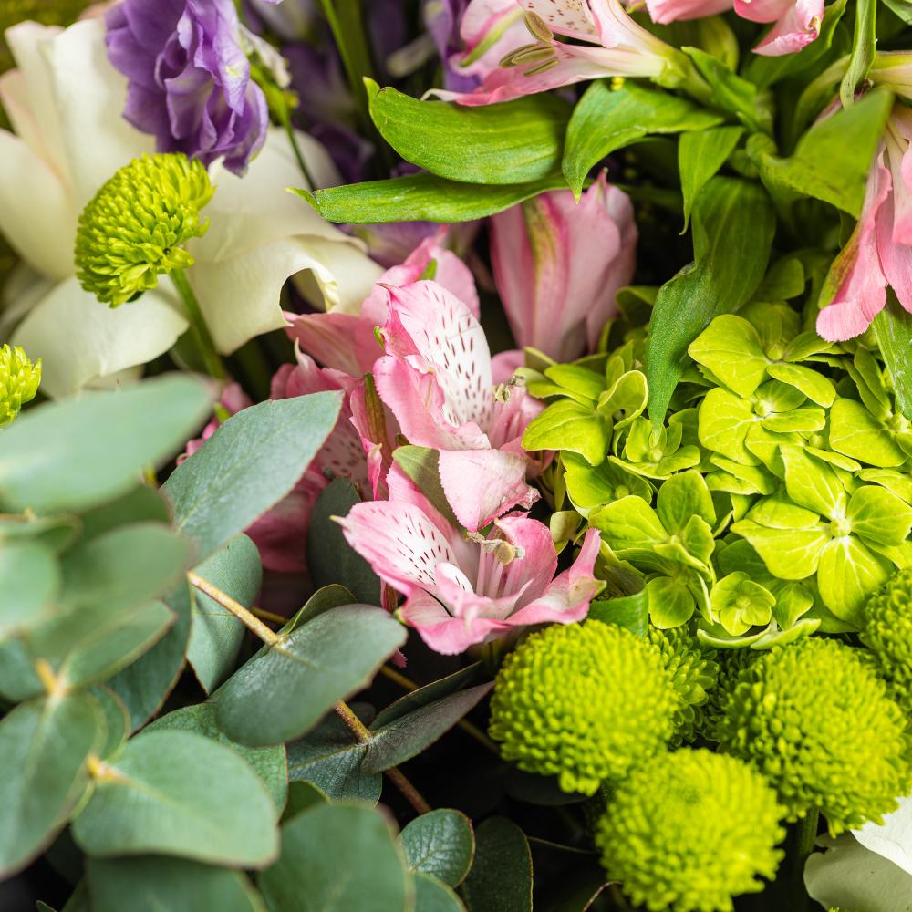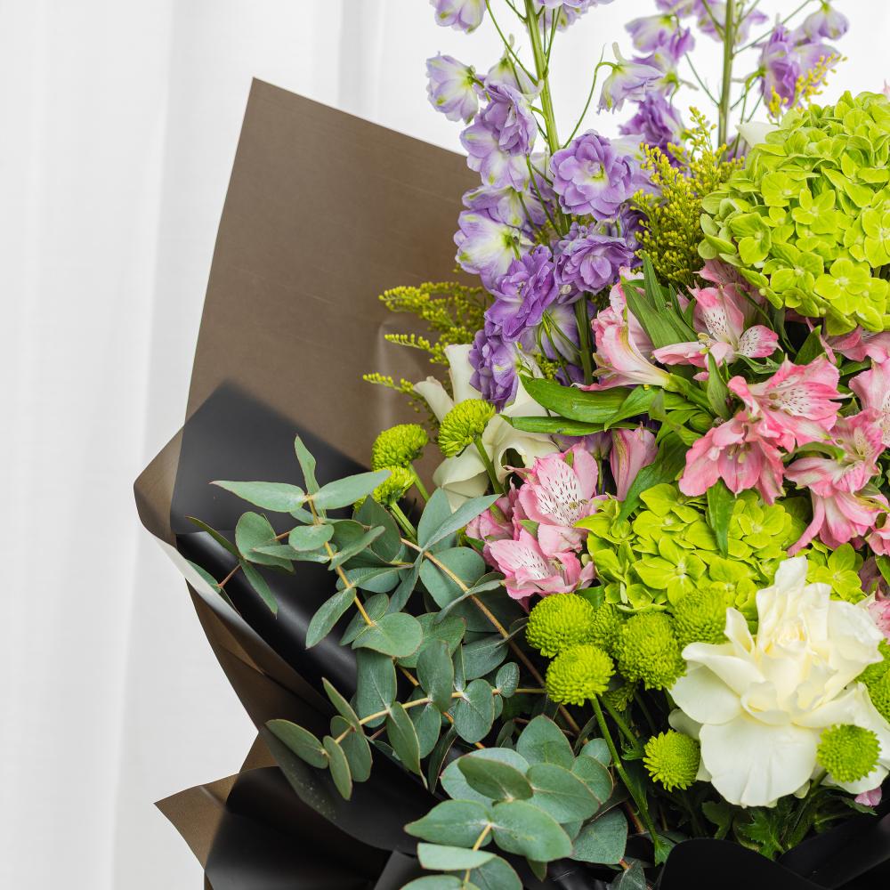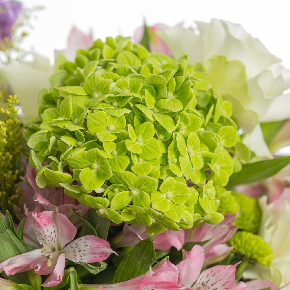 كل ذلك يتناغم مع همسات الطبيعة ، حيث 🌿 أربعة أعواد من الأوكالبتوس العطري تحملك إلى غابة مسحورة . وعنقودان من الهدرانج الأخضر يزيّنان المشهد بحضور مهيب، كأنهما تيجان خضراء 🌿 تزفّ الباقة إلى لحظة خالدة .