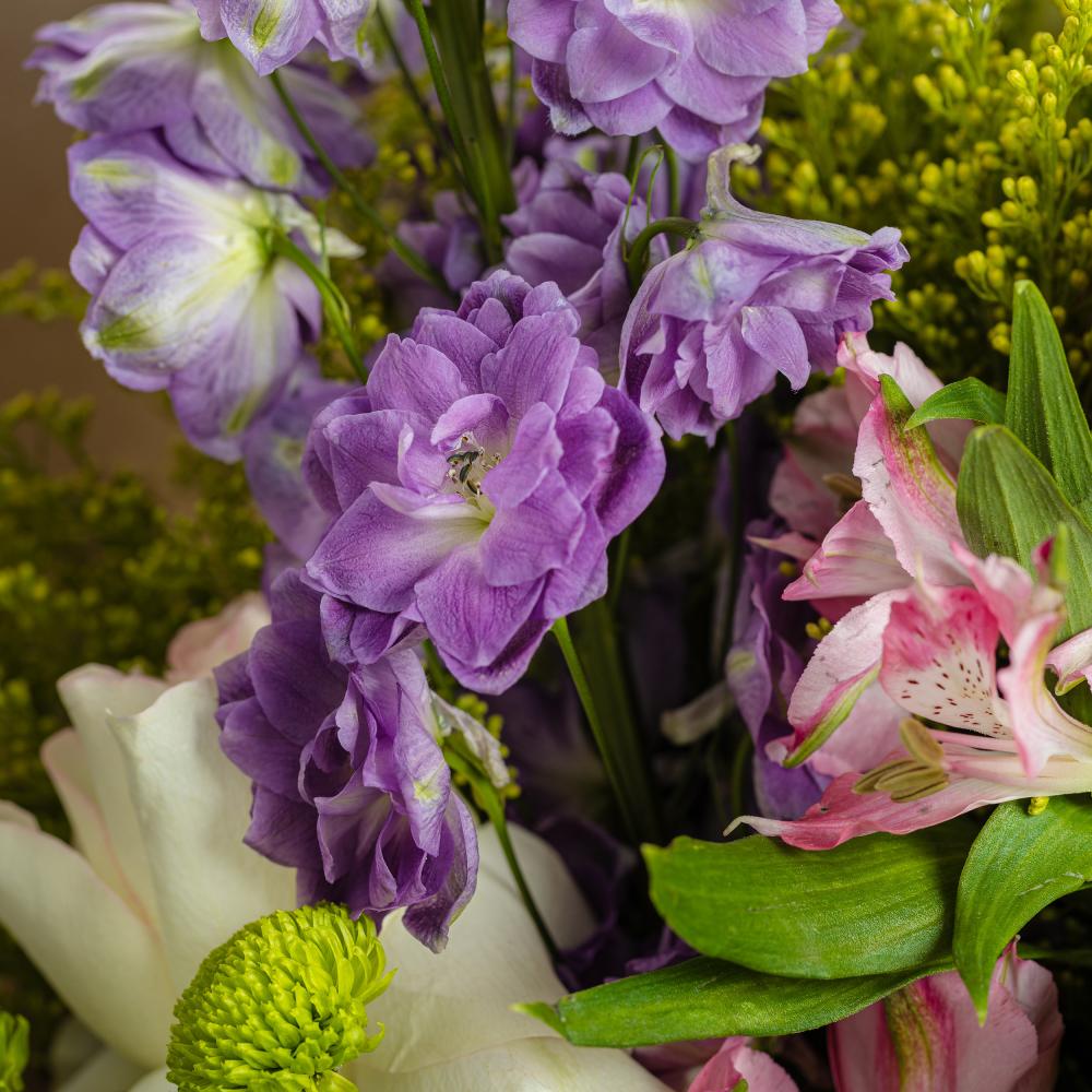 ومن خلف الستار، تمتد زهرَتان من دلفينيوم الليلكي بلونهما الهادئ كأنفاس الفجر ، ترتفعان برقة نحو السماء ، كدعاء ناعم لم يُنطق به .