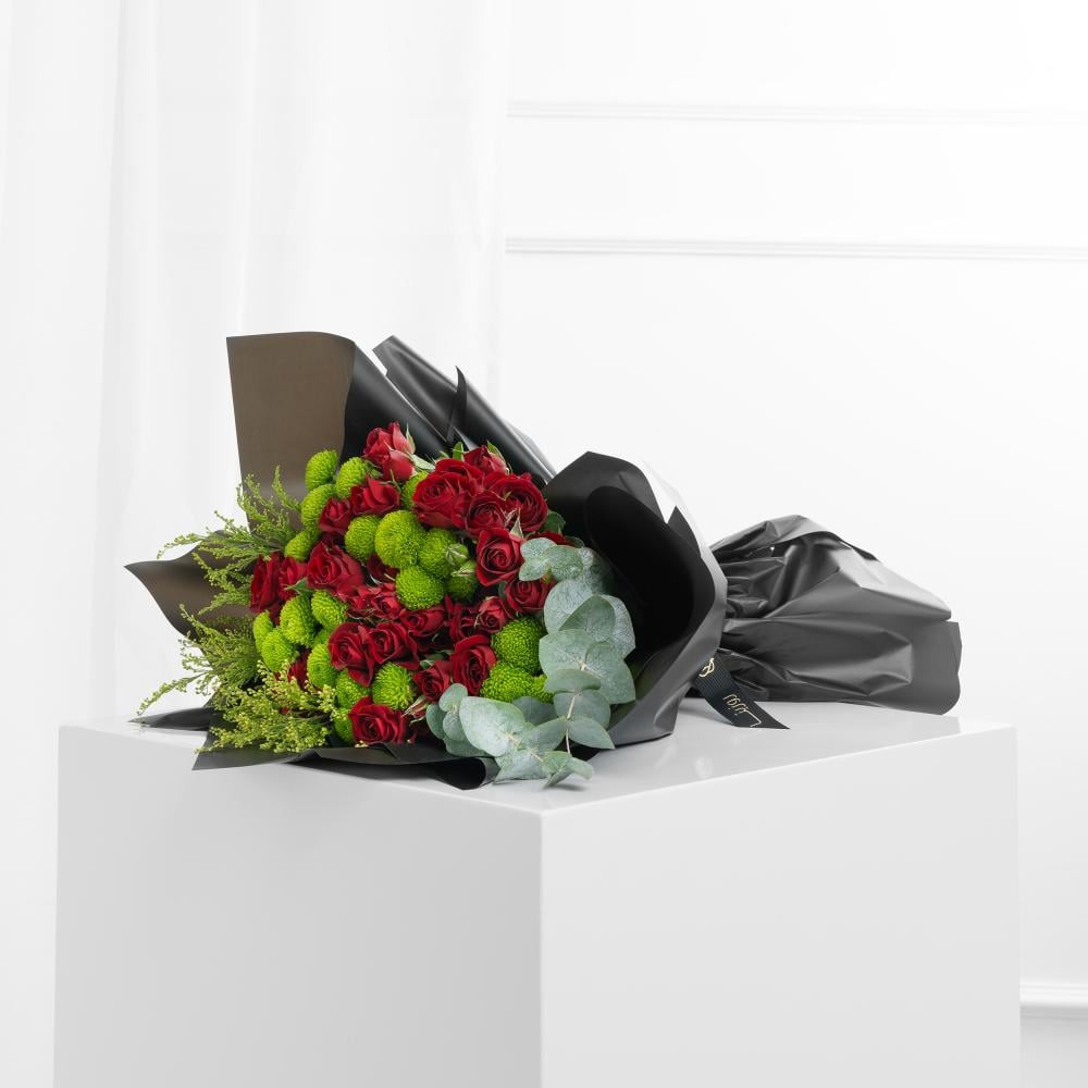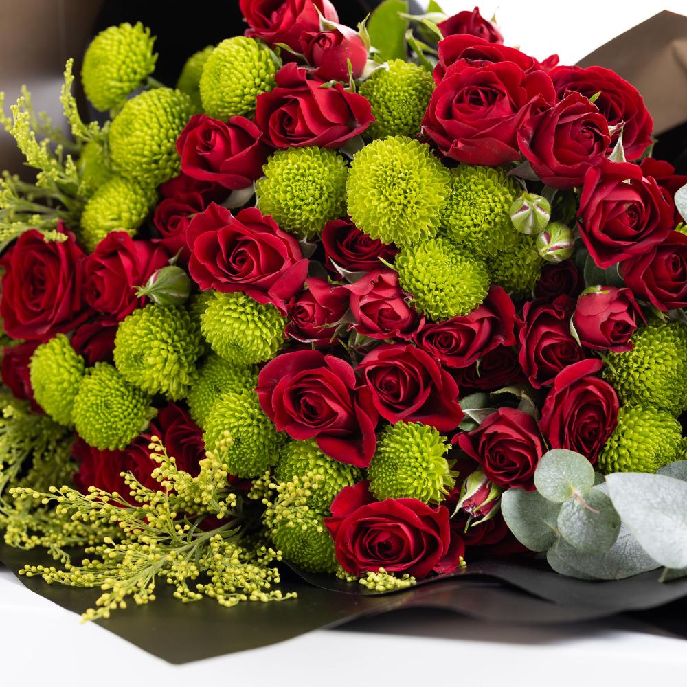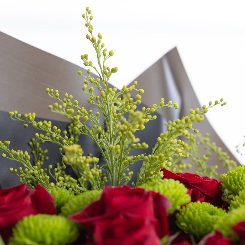تضيف خمسة أقحوانات كريز خضراء فاخرة لمسة من البرودة المنعشة، مما يخلق تباينًا ساحرًا يبرز جمال الورود الناري.
