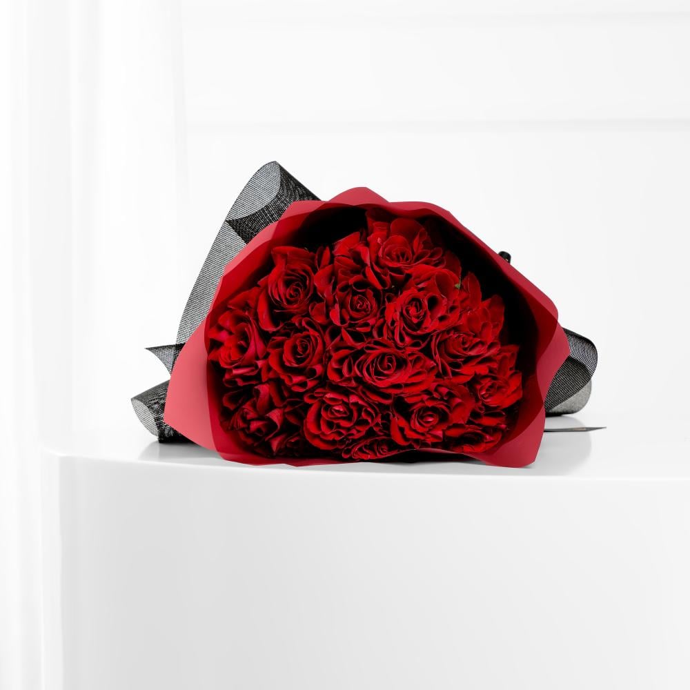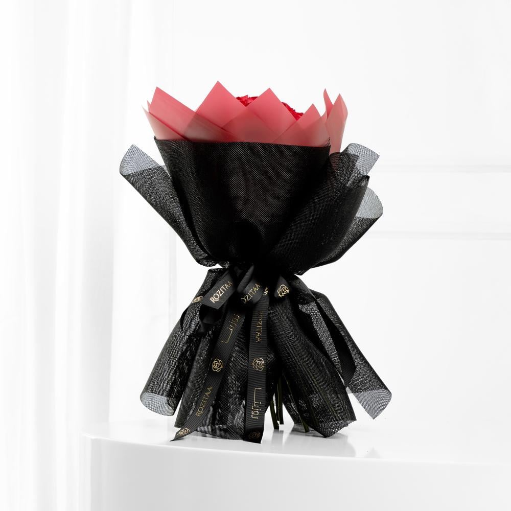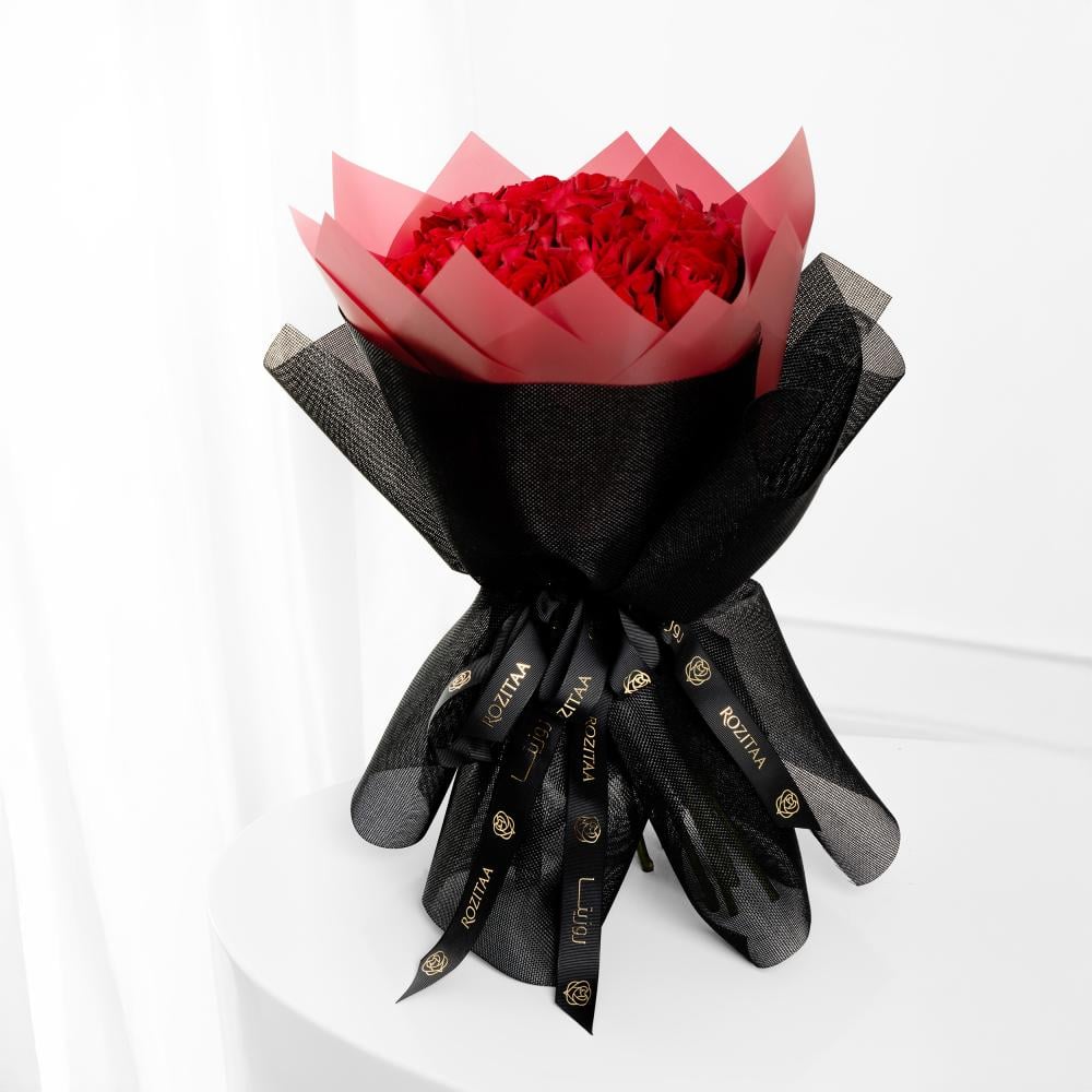 يحتضن هذا الجمال تغليفٌ فاخر يجمع بين الرقة والغموض. تبدأ القصة بطبقة داخلية من اللون الوردي الحالم، تلامس روح الورد وتُبرز حيويته. ثم يأتي التغليف الأسود الأنيق ليُضفي عمقًا وتباينًا بصريًا ساحرًا، فيعزز من وهج اللون الأحمر الناري للورود، تمامًا كقصص الحب العظيمة التي تجمع بين القوة والرقة في آنٍ واحد. الشريط الذي يحمل اسم "روزيتا" يضيف لمسة نهائية من الفخامة التي تليق بمشاعرك