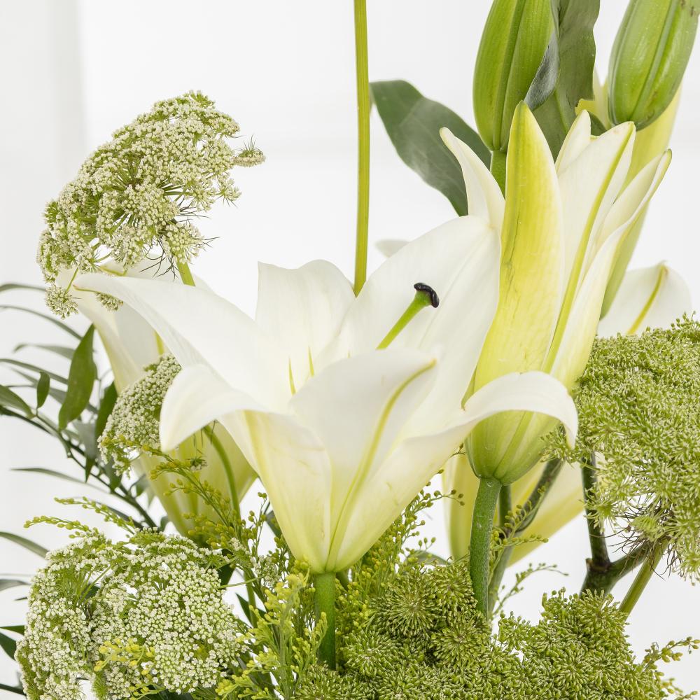 تتكامل زهور ايمي الخضراء، بجمالها الطبيعي ومظهرها العشبي الفريد، لتضفي على الباقة 🌱 حيوية وانتعاشًا لا مثيل له.