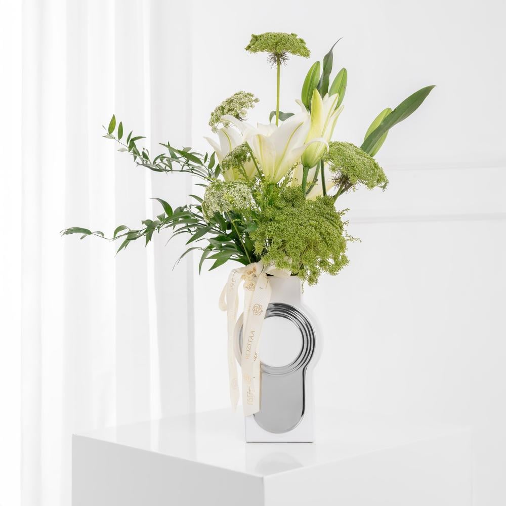تحتضن الفازة البيضاء الصغيرة، بتصميمها الأنيق والعصري، هذه السيمفونية الزهرية بكل رقة.