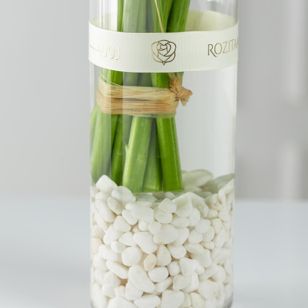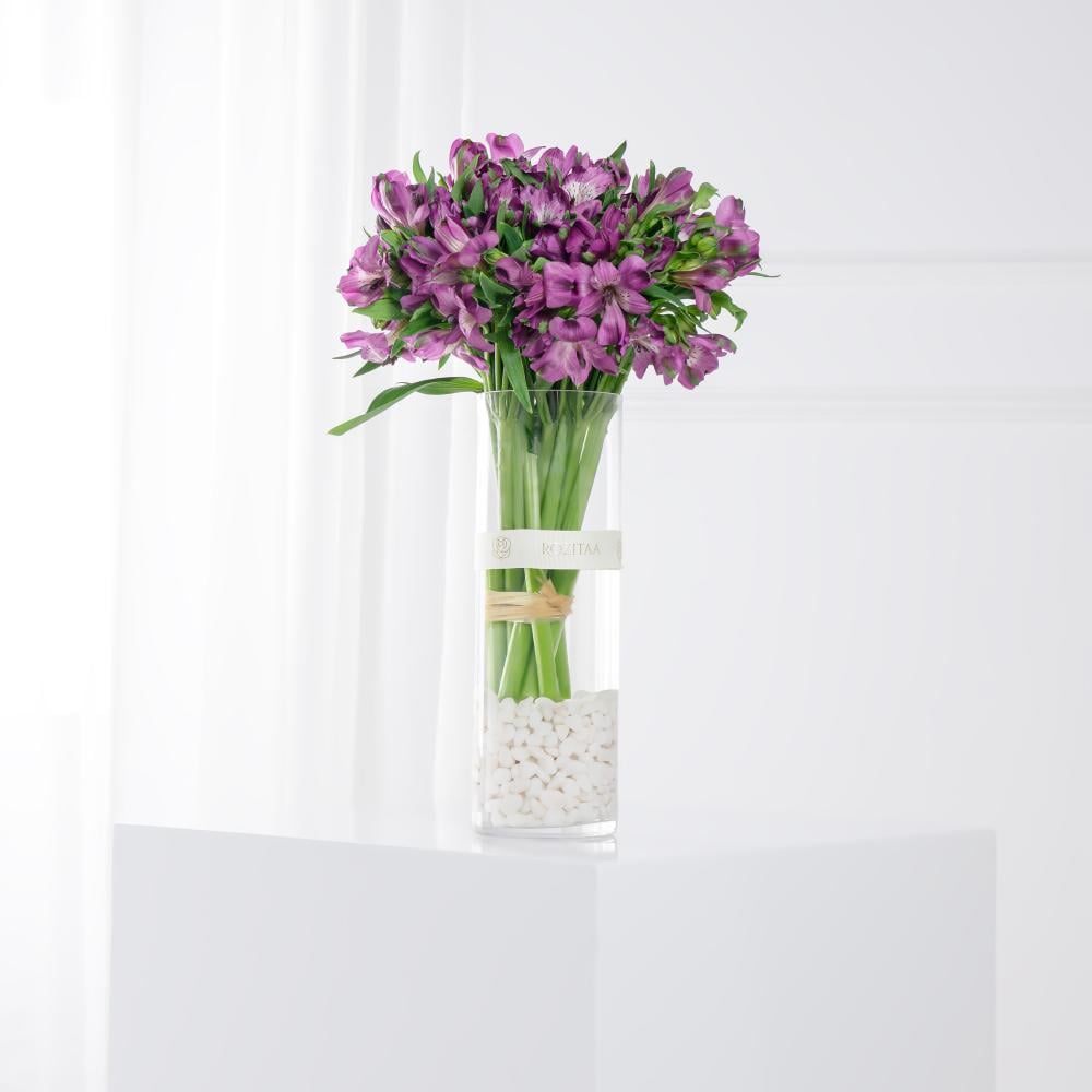 ينسدل جمال البنفسجي داخل فازة زجاجية طويلة وشفافة، ترتكز على قاعدة من الحجر الأبيض النقي، مما يخلق توازنًا بين النقاء والغموض، ويجعل الباقة قطعة فنية مثالية لأرقى المناسبات.