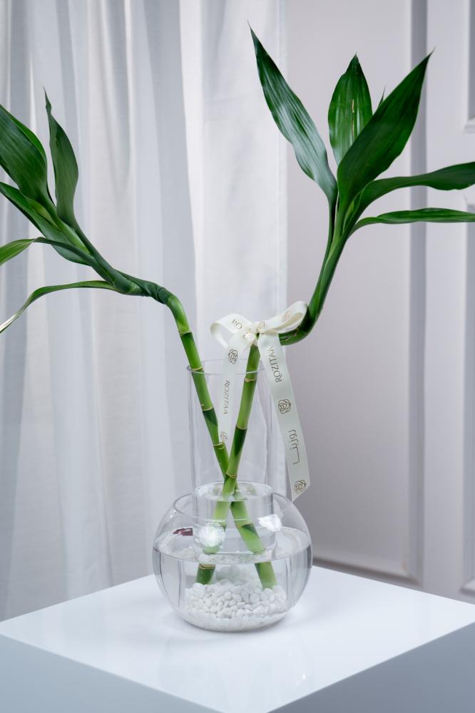 يرتفع ساقان من اللاكي بامبو الأخضر النضر برشاقة وأناقة. بحسب تقاليد فن "الفينغ شوي"، يرمز ساقا البامبو إلى الحب والسعادة العاطفية، ليجلبا طاقة إيجابية متجددة إلى مساحتك.