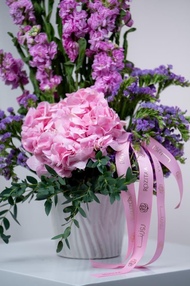 تتربع في قلب هذه الفازة البيضاء الأنيقة زهرة الهيدرينجا الوردية، رمزاً للمشاعر الصادقة والامتنان، كقلب نابض يفيض بالحب.