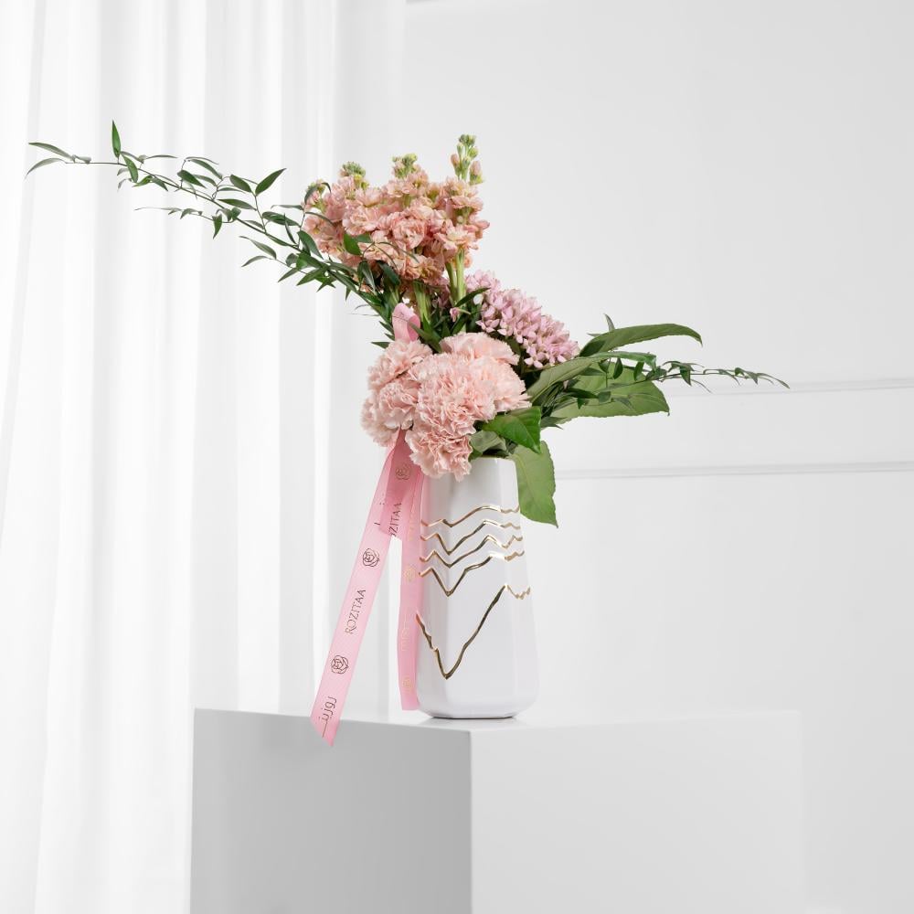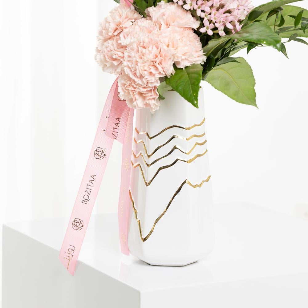 - الفازة مغلفة بـ عشر طبقات من التغليف الأبيض النقي، يعكس بساطة التصميم ويبرز ألوان الورود الزاهية، ليجعل من لحظة تقديمها تجربة لا تُنسى.