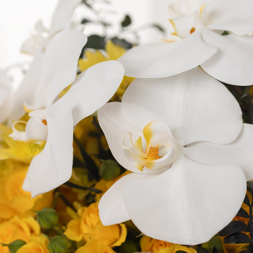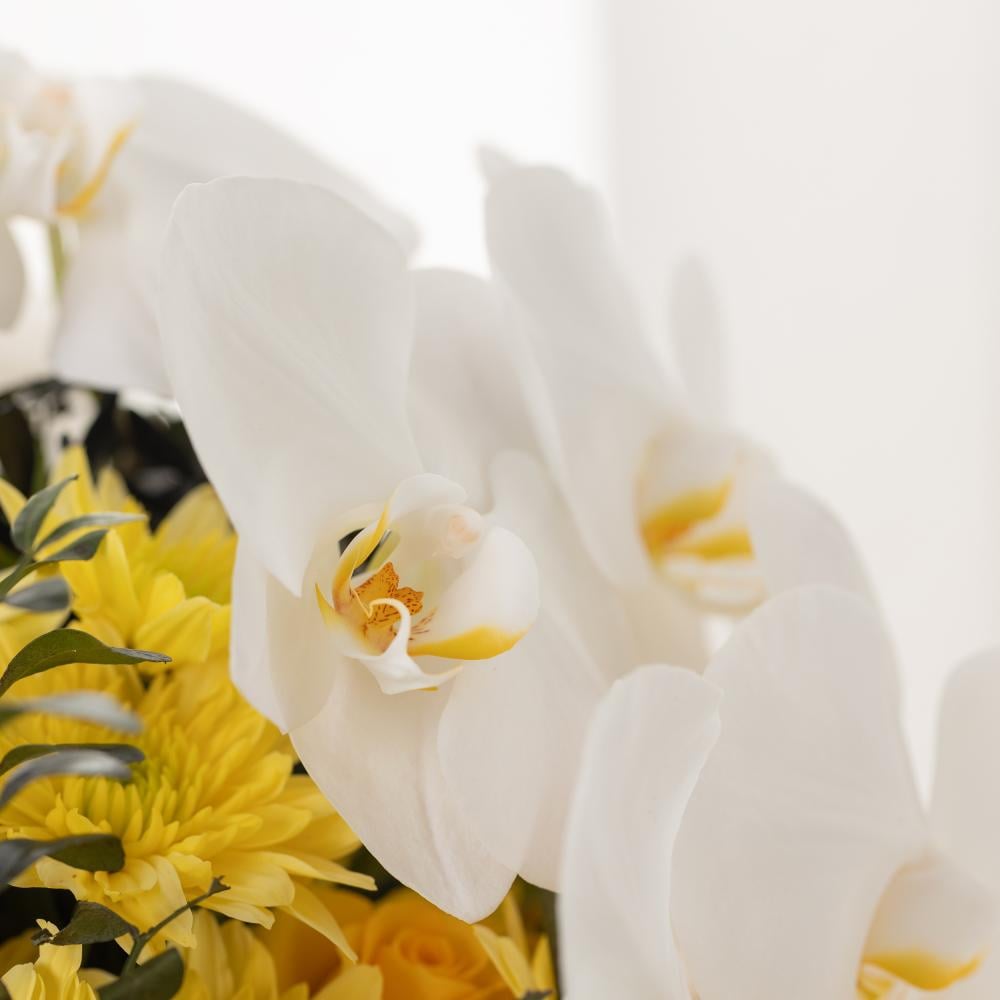 ولأن كل لحن يحتاج إلى توازن، تأتي عشر زهرات فلانبسس بيضاء، ناصعة كقطرات ندى، تعبّر عن الصفاء والسكينة. الأبيض هنا لا يطفئ الأصفر، بل يحتضنه، ويمنحه مساحة للتألق في تناغم بصري ساحر.