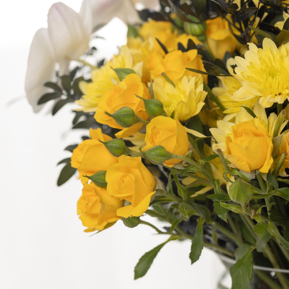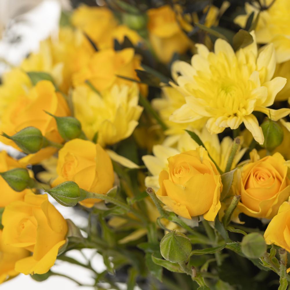 تبدأ هذه الباقة بنغمة دافئة من البيبي روز الصفراء، عشر زهرات صغيرة كأنها شمس مصغّرة في راحة اليد. لونها الذهبي يرمز للفرح، التفاؤل، والدفء، ويمنح الباقة طاقة مشرقة تنبض بالحياة.