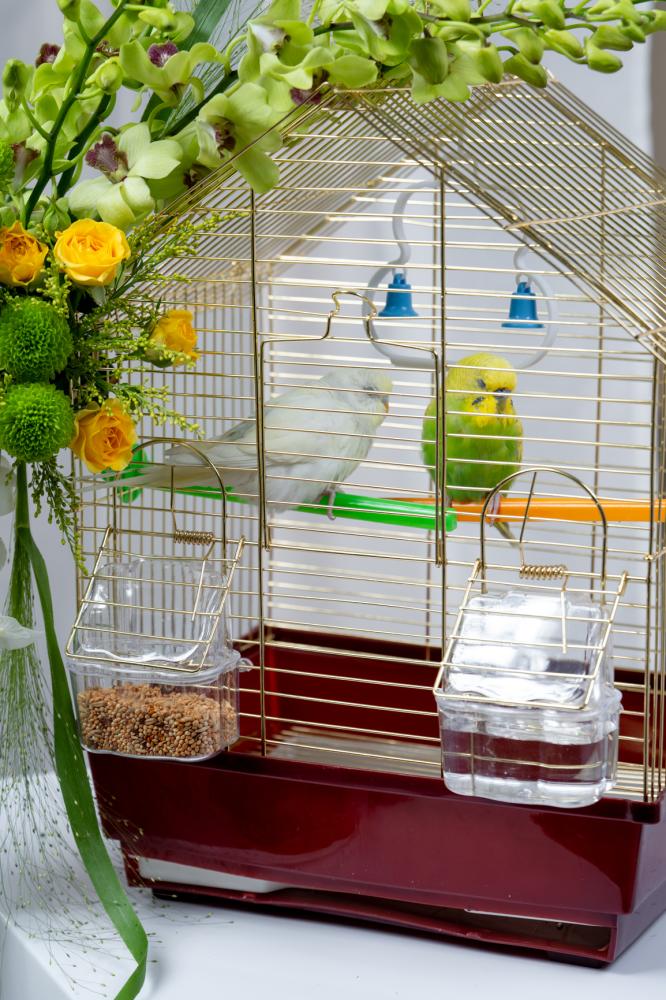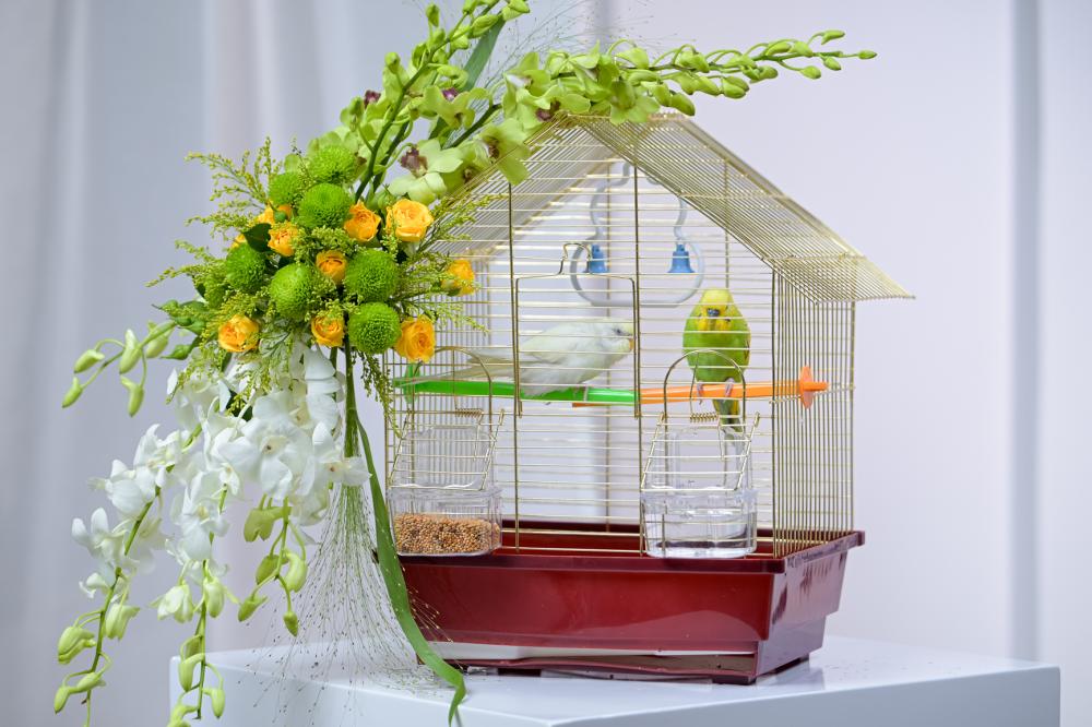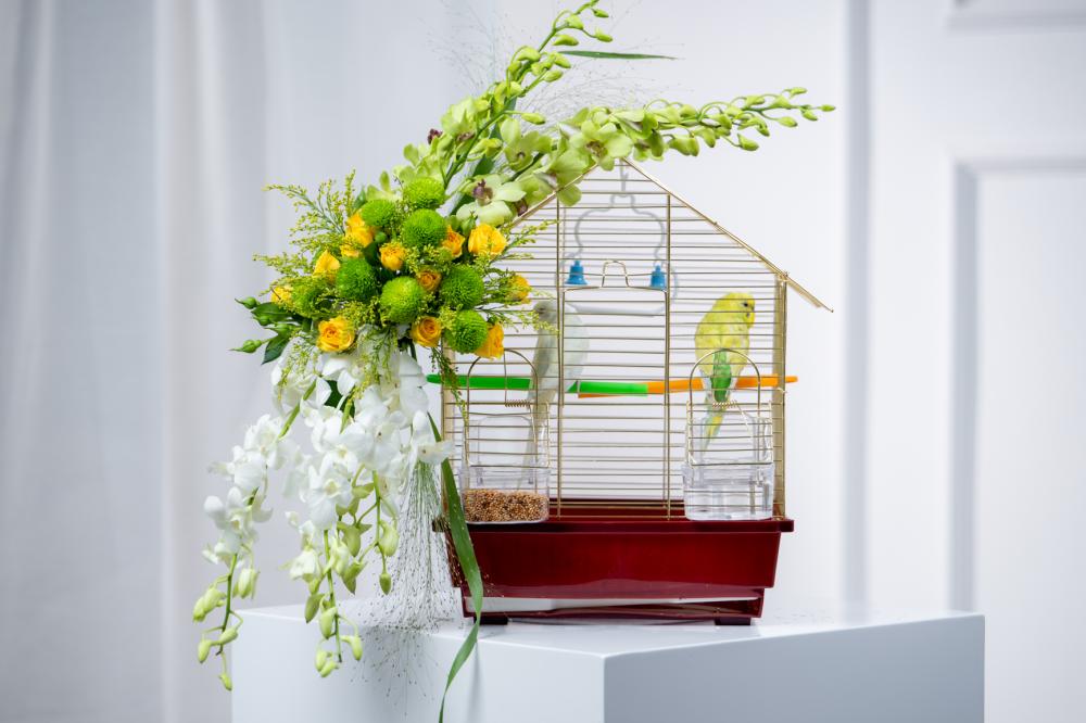 يكتمل التناغم اللوني بلمسة من السلداجو الأخضر، الذي يضيف نسيجًا فريدًا ويبرز جمال الزهور الأخرى، معززًا الانسجام البصري. أما داخل القفص الذهبي، فتتألق عصافير الحب بألوانها الزاهية، تضفي روحًا من البهجة والحياة.