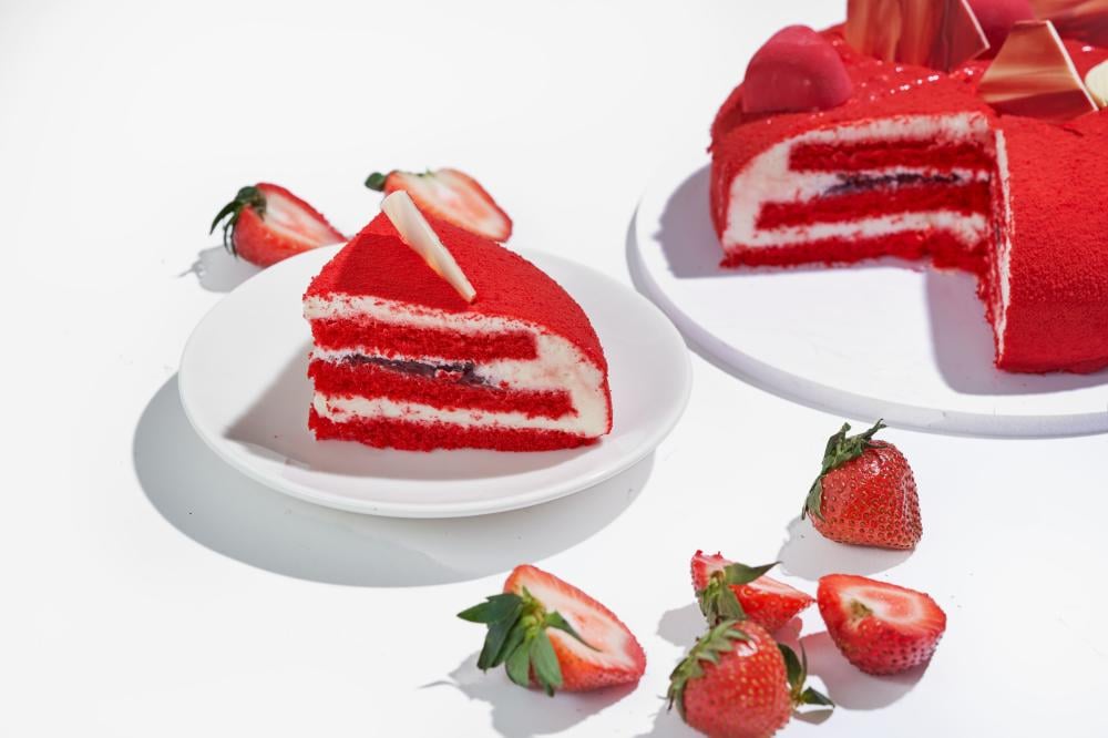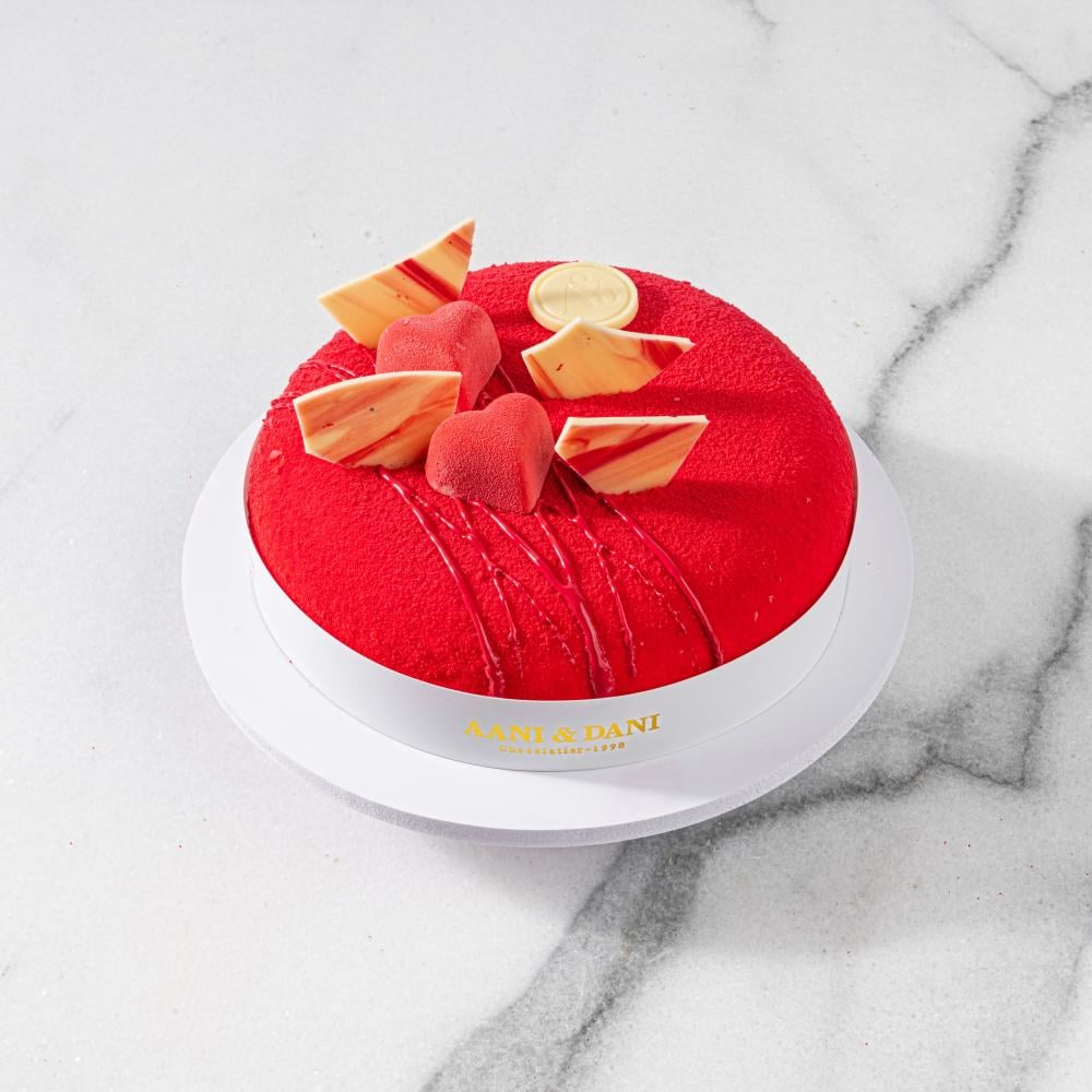 كيكة راقية مع مربى الفراولة اللذيذة و جبنة كريمة مزينة بأزهار ورد حمراء وقطعة شوكولاتة اني وداني البيضاء.