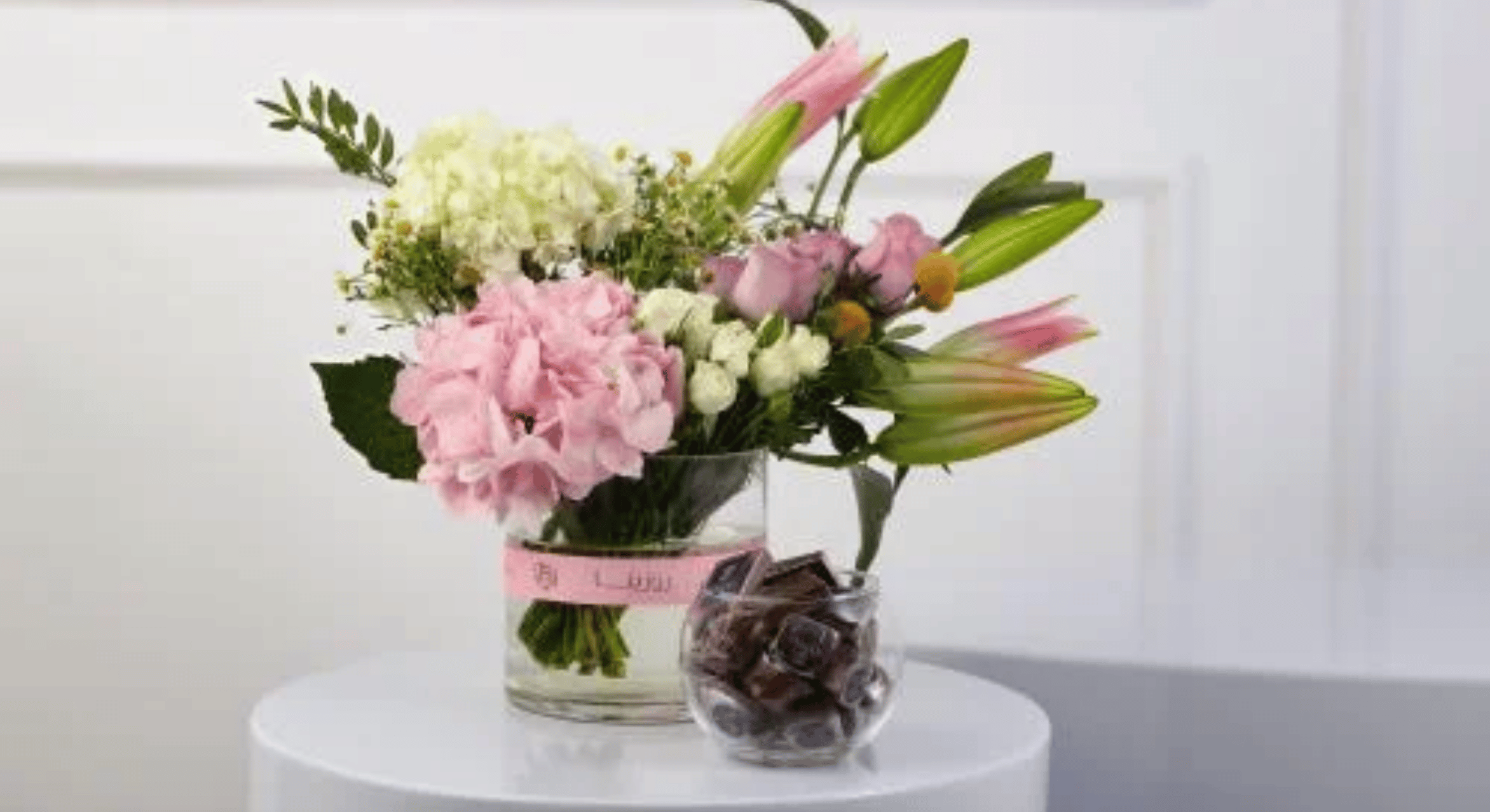 1. باقة الزهور + الشوكولاتة: أنت صانع البهجة ومُقدِّر اللحظات الجميلة