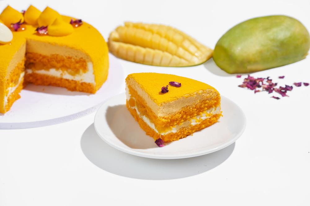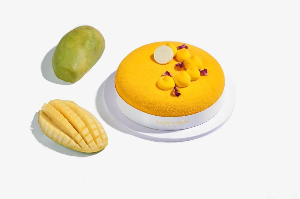طبقات من سبونج مانجو وحشوة مانجو مع تشيز كريم مرشوش بطبقة من اللون الاصفر مزين بحشوة مانجو و ورد مجفف مع شعار اني وداني شوكولا.