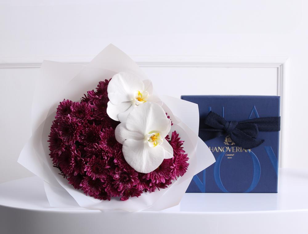 A bouquet of purple roses adorned with pure white orchids, accompanied by a luxurious Hanoverian chocolate box. A gift that expresses both refined taste and warm feelings. An ideal choice for someone who deserves a special moment blended with beauty and luxurious taste.