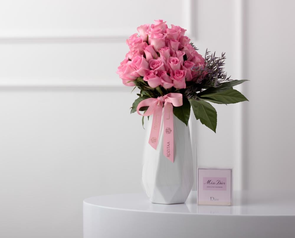 Pink rose vase with Miss Dior perfume for women - a sweet gesture full of love.