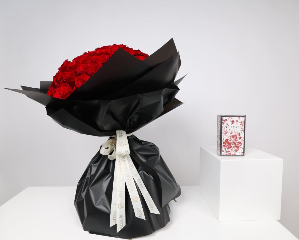 Express your true feelings to her with a bouquet of roses and perfume. Give her this gift to win her heart, feelings and mind. Offer her a bouquet of red roses, a symbol of love, with the luxurious and attractive Gucci perfume. She will not resist and will fall in love with you even more.