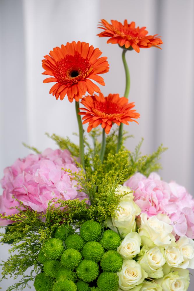 This enchanting color combination, from the pure white of the rose , to the green of the saldago and cress , through the warm orange of the galbera , and the delicate pink of the hydrangea , creates a unique visual harmony , reflecting a modern coordination style that skillfully blends classicism and spontaneity.